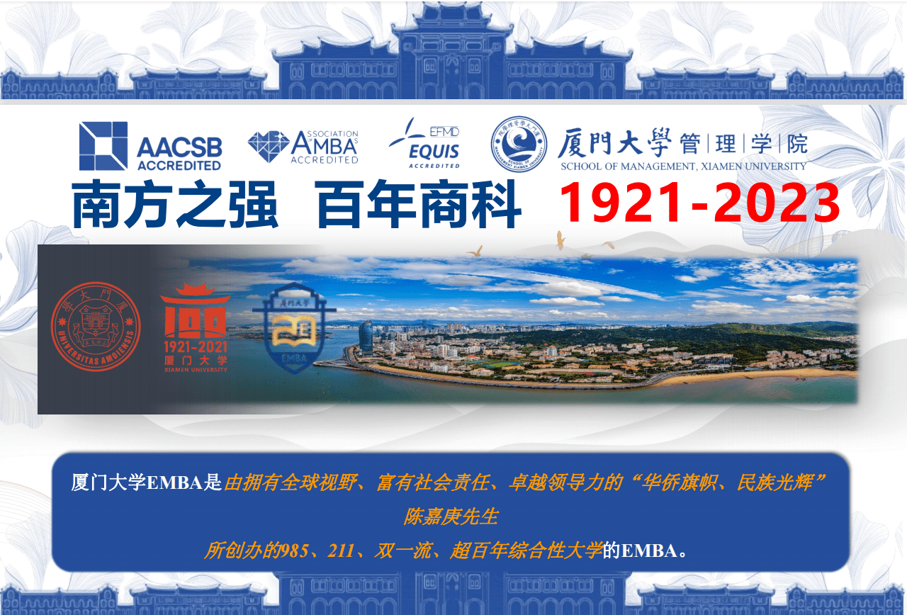 厦门大学EMBA由拥有全球视野、富有社会责任、卓越领导力的“华侨旗帜、民族光辉” 陈嘉庚先生 所创办的985、211、双一流、超百年综合性大学的EMBA.MBA。