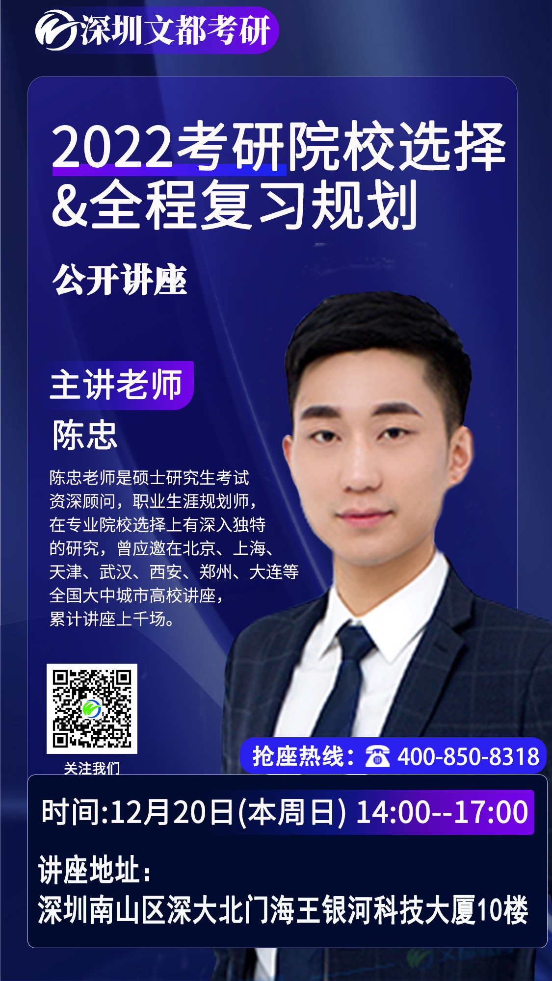 2022考研已经拉开帷幕,第一步择校择专业应该重视。选择专业时要考虑未来的职业发展道路,越早规划越少走弯路!扫下方二维码领劵0元领取备考规划指导课程! 2021年12月20日(本周日) 抢座热线:400-850-8318